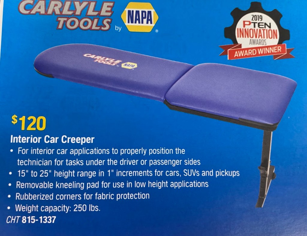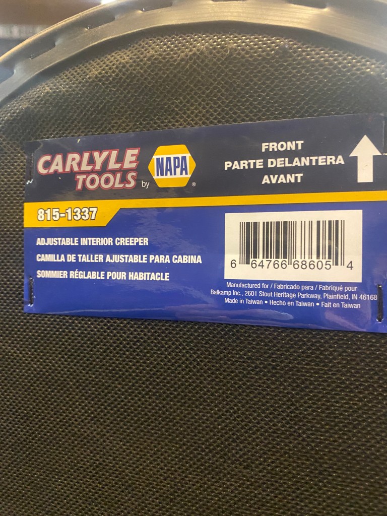 First addition to the list, the NAPA Carlisle Interior Car Creeper. I like to do alot of wiring and interior work and laying on my back or side, trying to get under the dash is just the worst. This cool creeper fixes that. It falls in to the “why didn’t I think of that” column. Out of the box, works great. But I can see that I will be having to make a taller leg for working under dashes of lifted vehicles. But for my Bronco, works fine. Check it out, it is in the NAPA tool flyer often, well worth the $120.