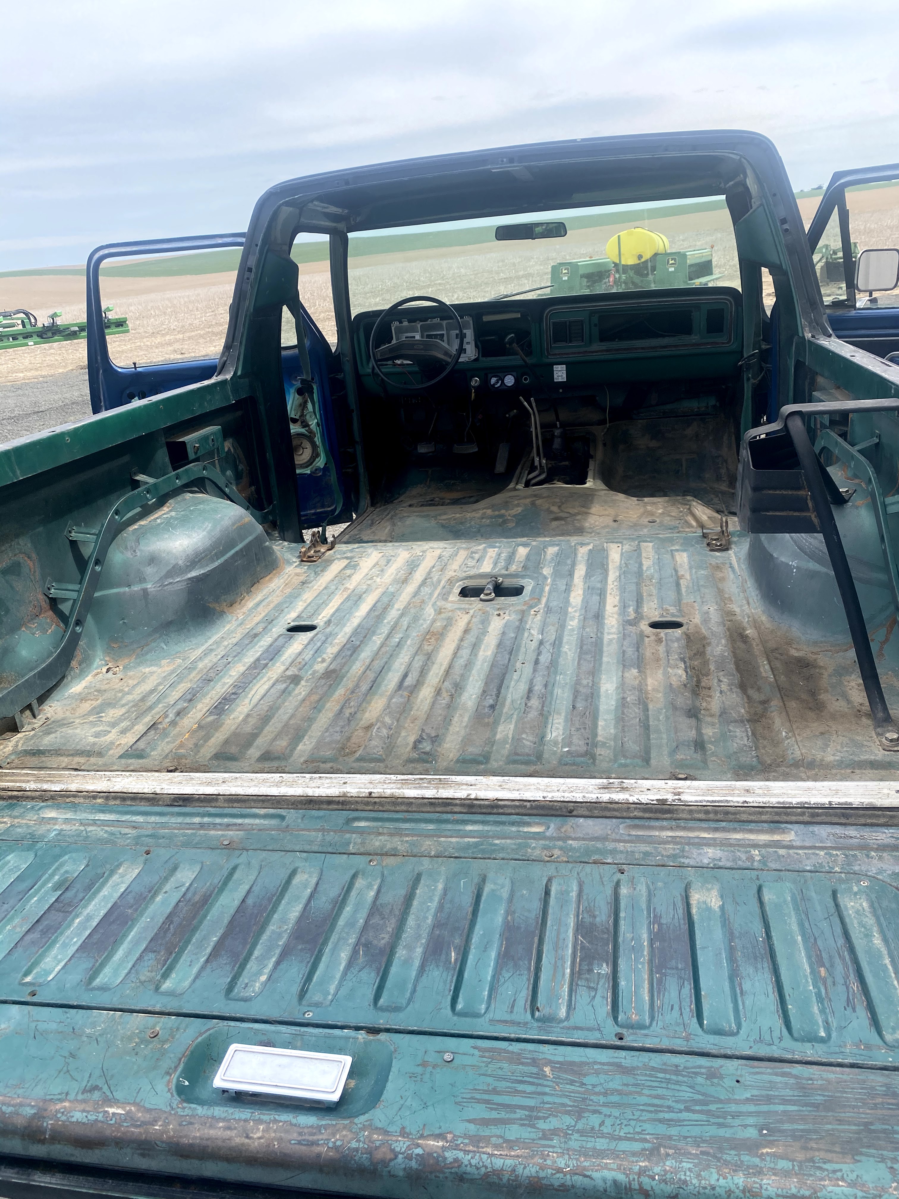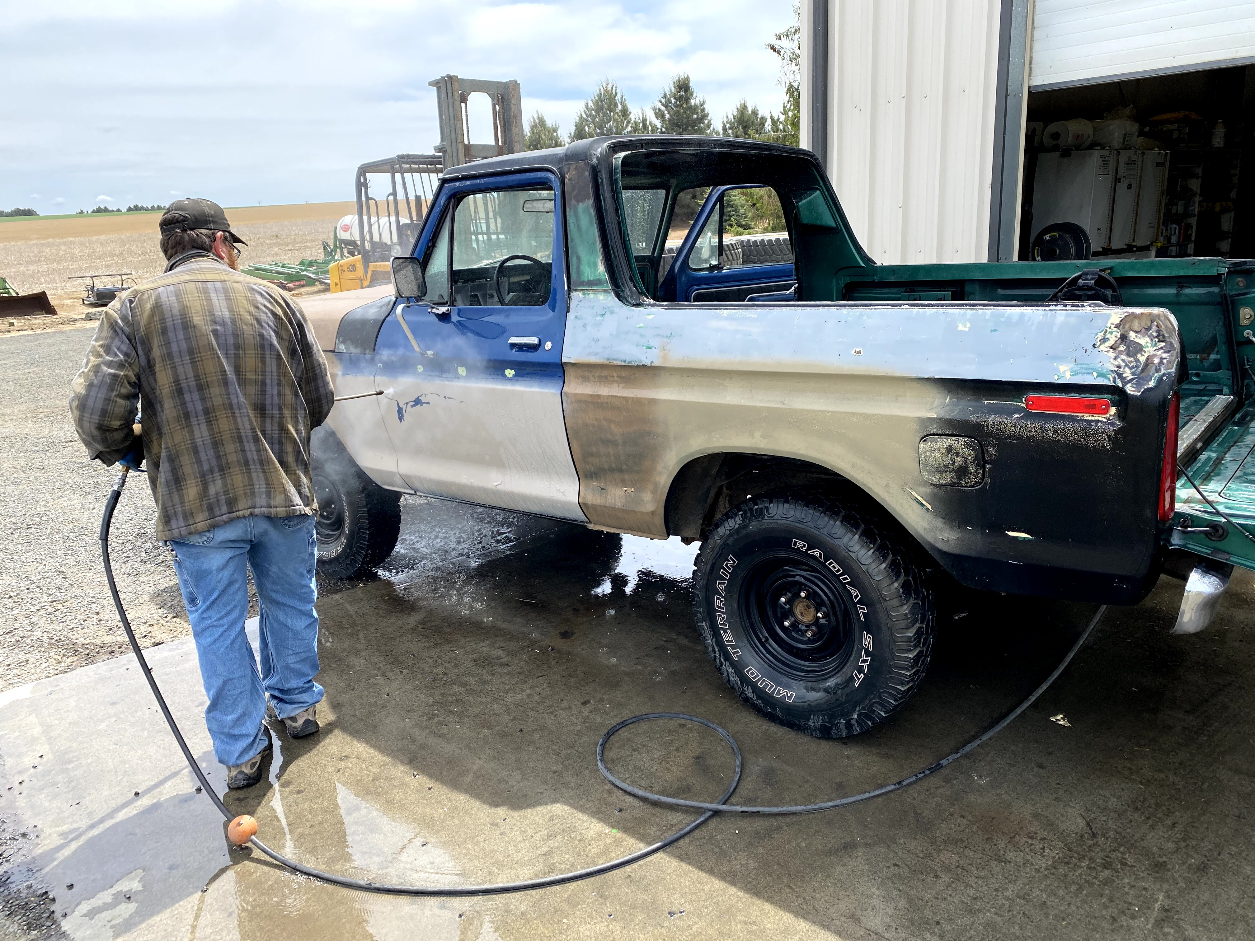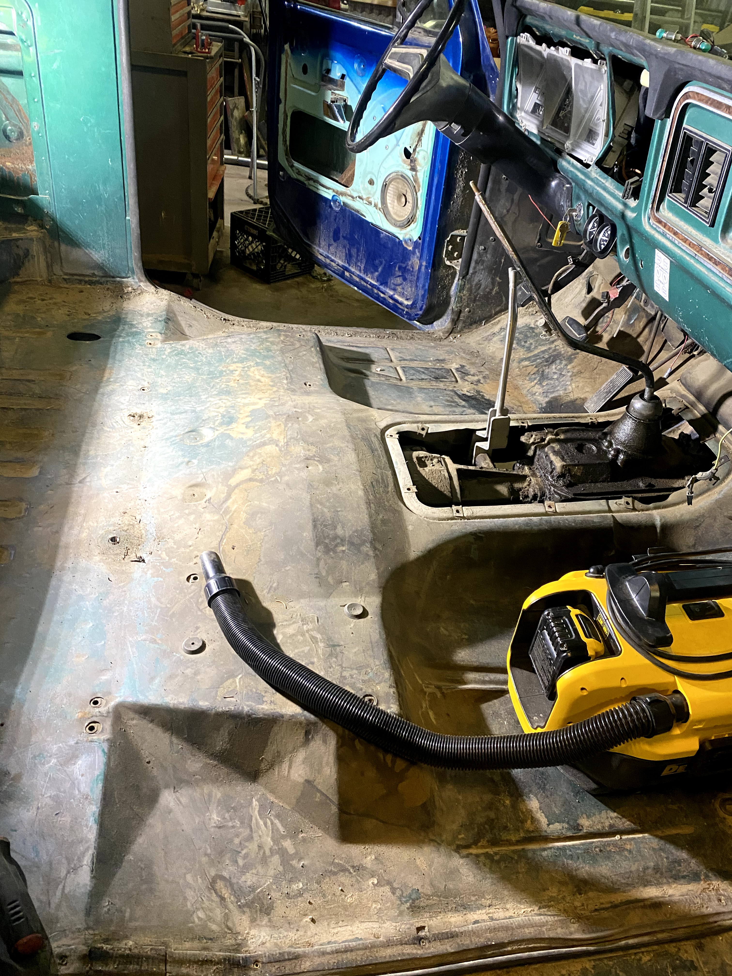 Once we had it running, we moved on to getting the floor prepped for bed liner. It appears that the old oil pressure gauge was leaking for a long time by the grime that was under the pedals. So we decided it was just time to steam clean the inside as well as the out side. Along with the Bronco, I opted to also steam clean the seats, yes, the seats. The seats are from the donor Bronco and they were covered in pack rat poop and pee. Until they get rebuilt and recovered, we just steam cleaned them and put a blanket on them for now.