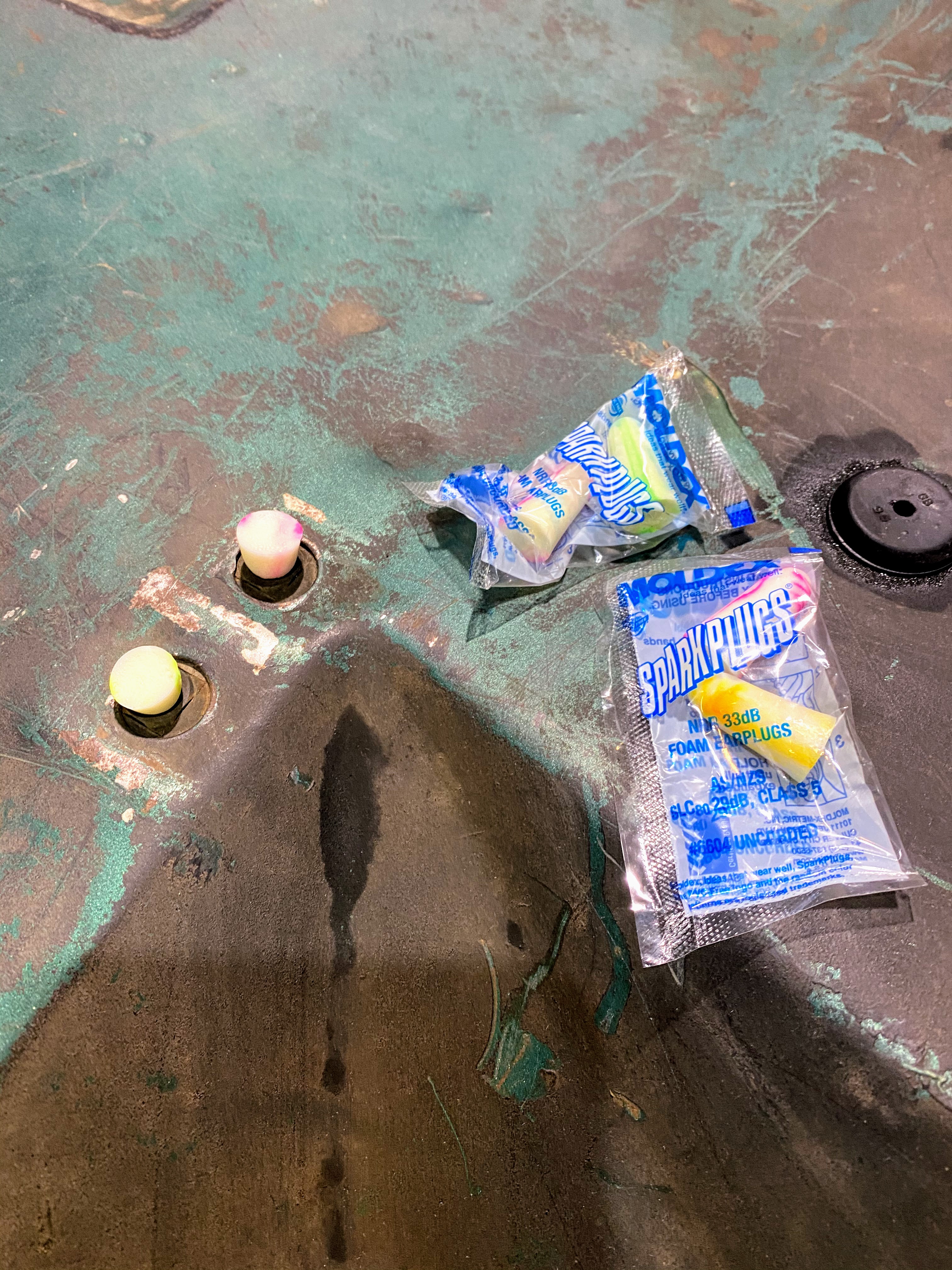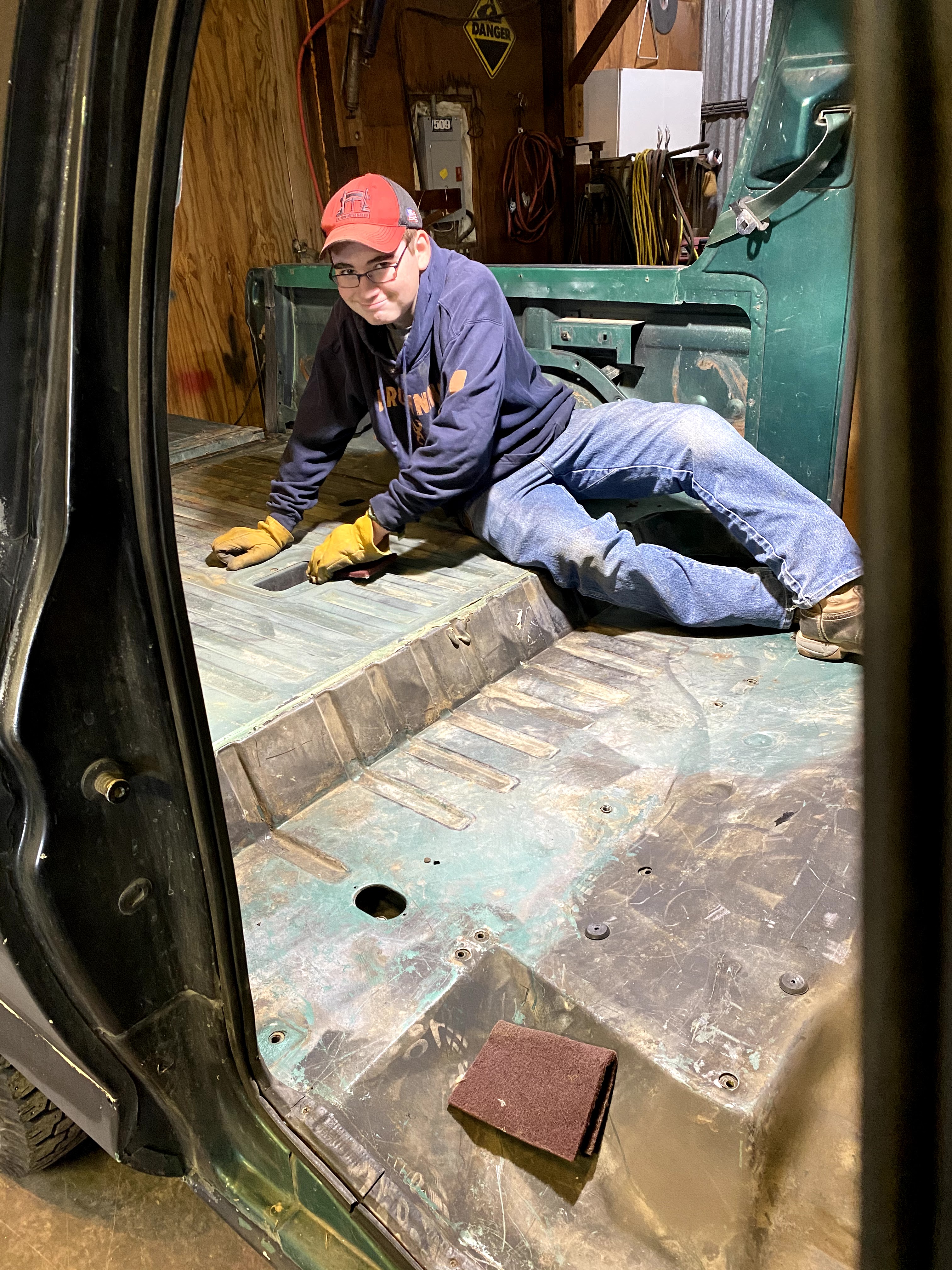 I decided its time to get the floor pan sealed up, so my youngest son Levi and I got to work. Someday, this Bronco will be getting a new insulated floormat from LMC truck, but that just isn’t in the Bronco’s budget at the moment. So to get it covered and sealed for now, we opted for a Duplicolor bed liner kit.