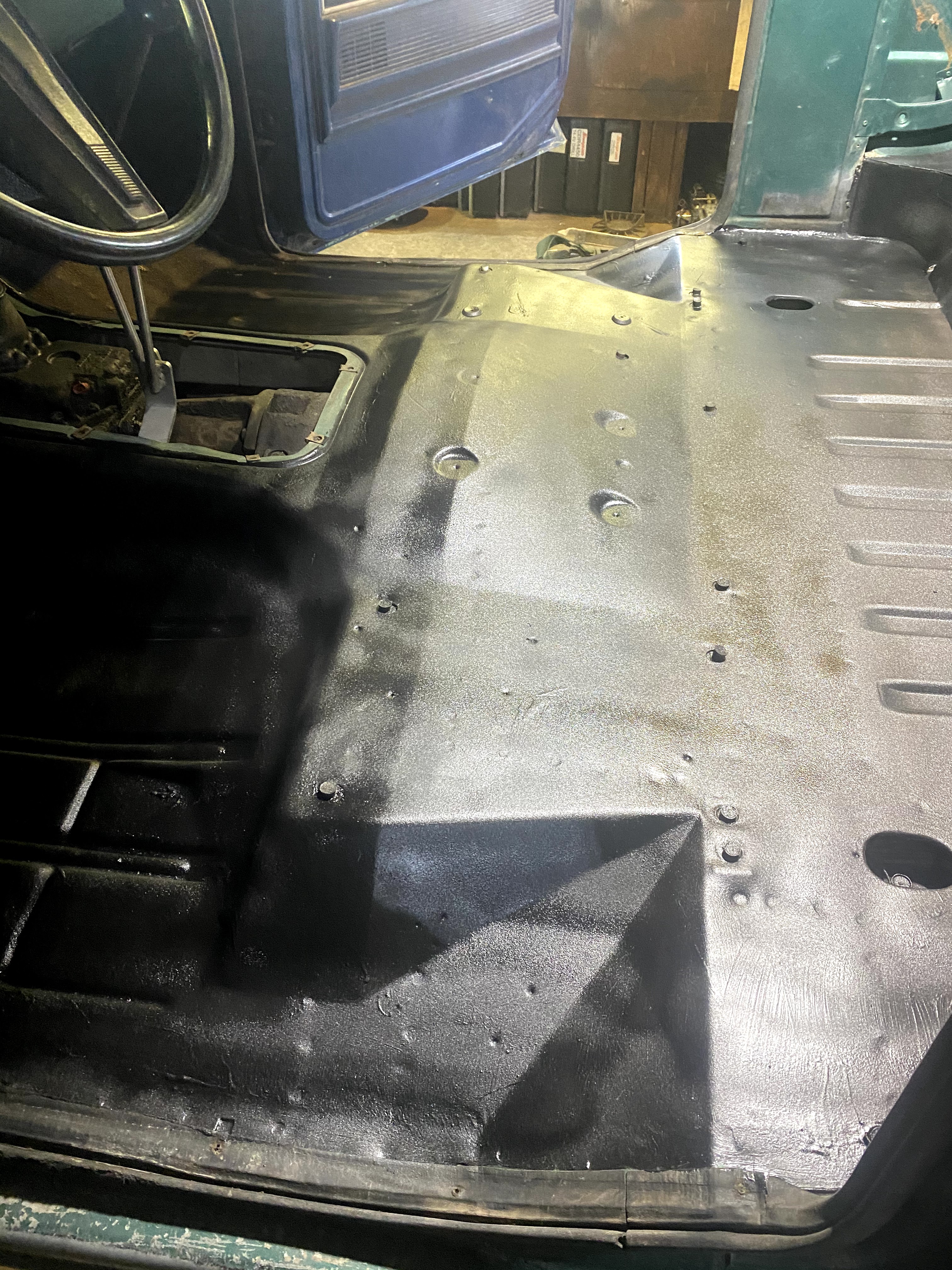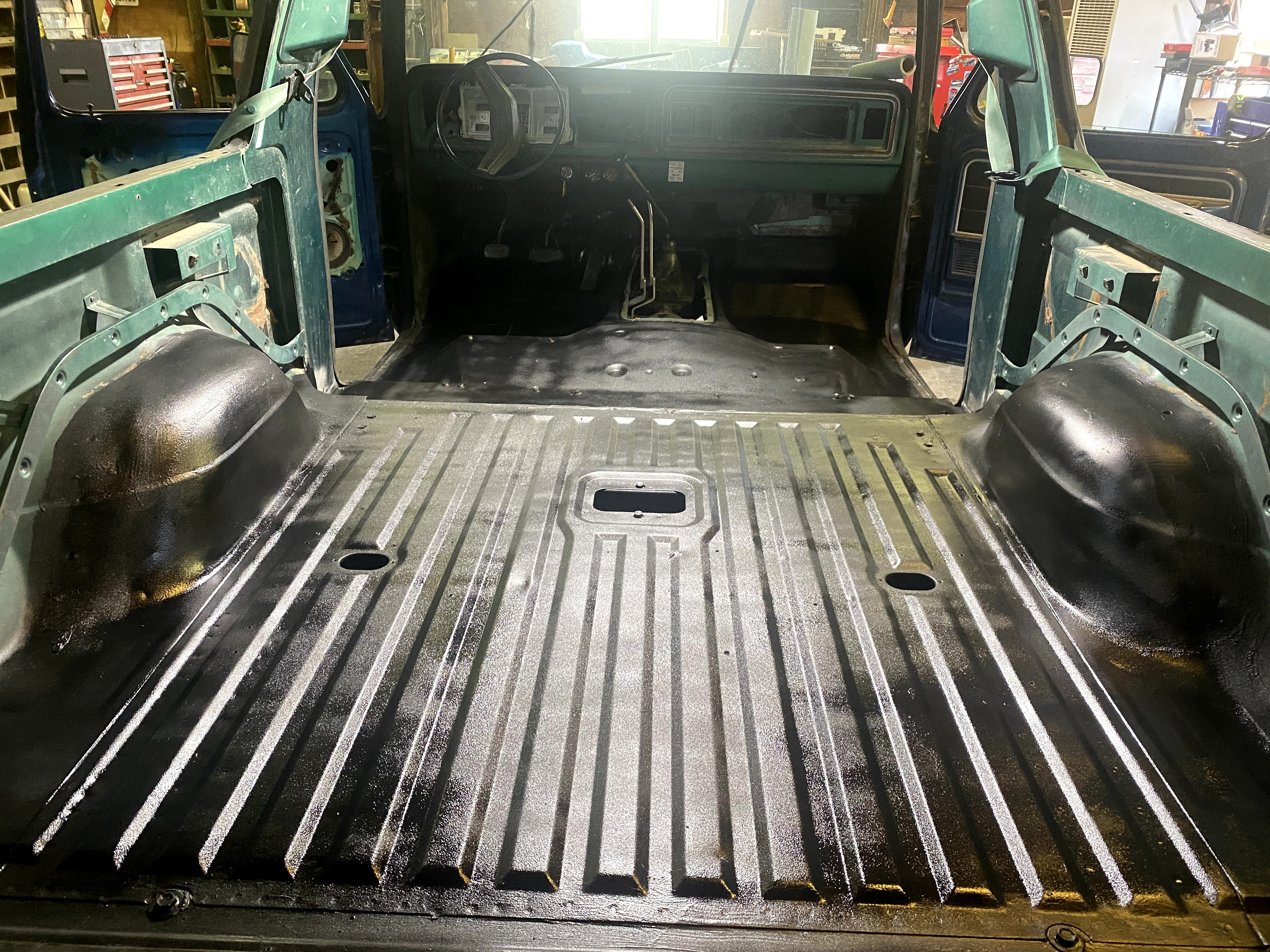 Tonight finds me in the shop enjoying the do it yourself bed liner in the Bronco. Is it perfect, no, is it better than it was, yes, much better. This finish will be great until I get the floor mat in someday. But now, I can get the shift boots, seat belts, seat brackets and seats put back in.